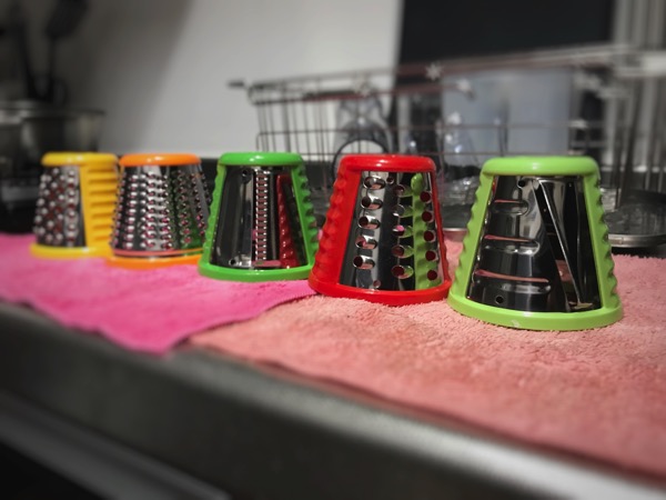 ▼最もよく使うドラムは、黄緑色。オニオンスライスをいつも大量に作るからです。玉ねぎは、サラダにも炒め物にも使えるので、いつも2個分の玉ねぎをフードカッターへ投入しています。